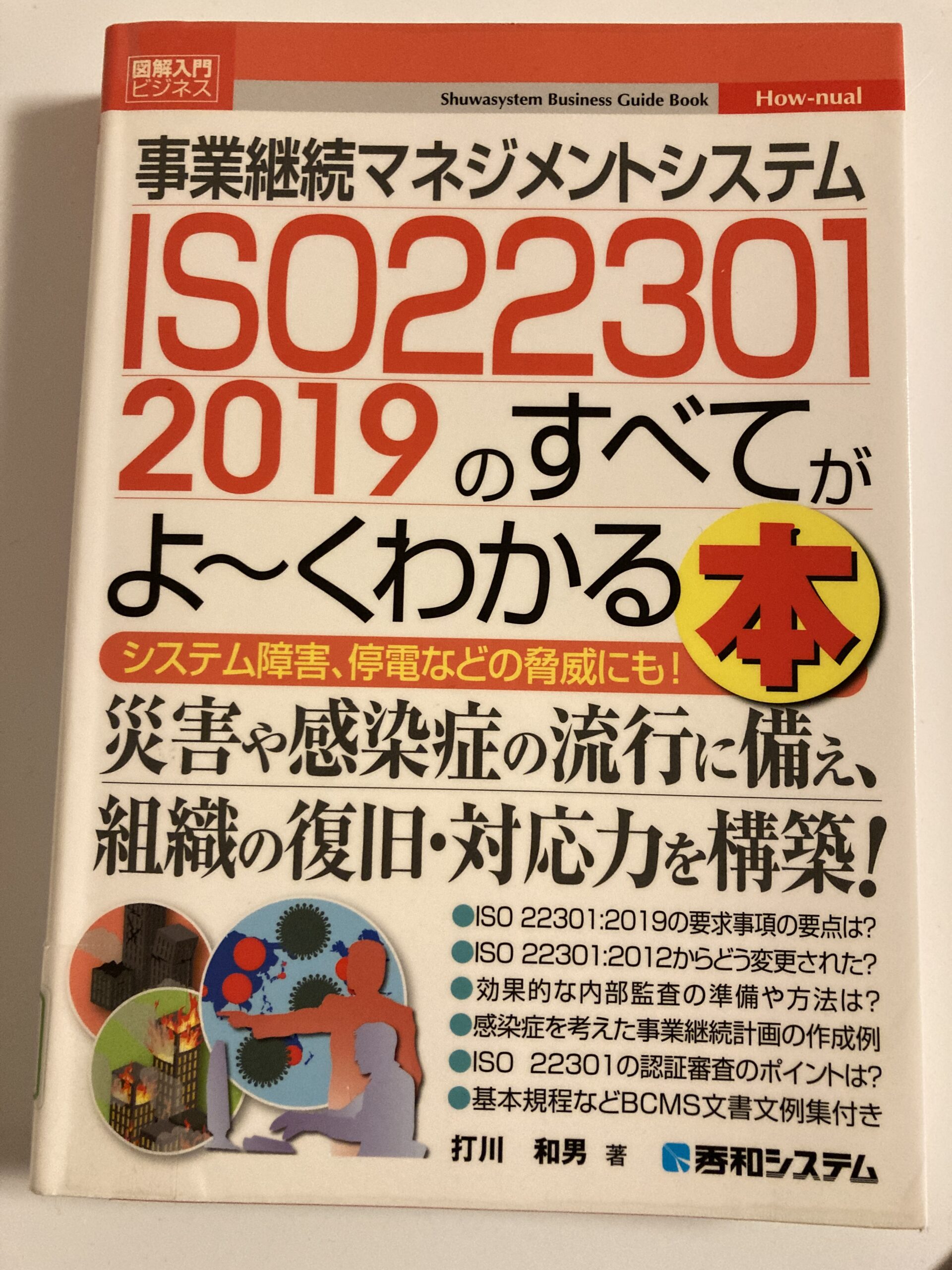 今回紹介する本は、「図解入門ビジネス 事業継続システム ISO22301:2019のすべてがよ~くわかる本(打川 和男著 秀和システム)」です。