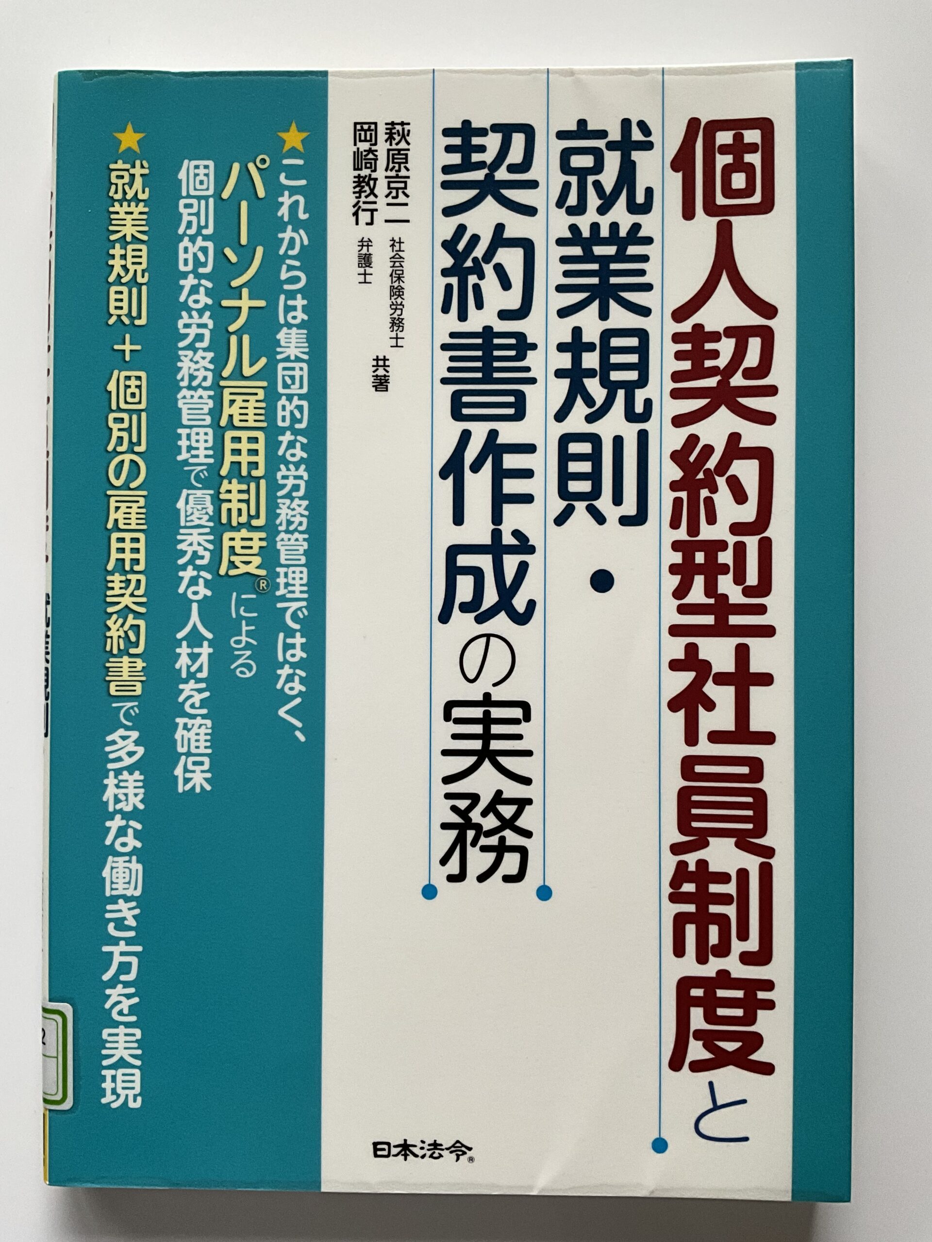 今回紹介する本は、「個人契約型社員制度と就業規則・契約書作成の実務(萩原 京ニ、岡崎 教行 著 日本法令)」です。
